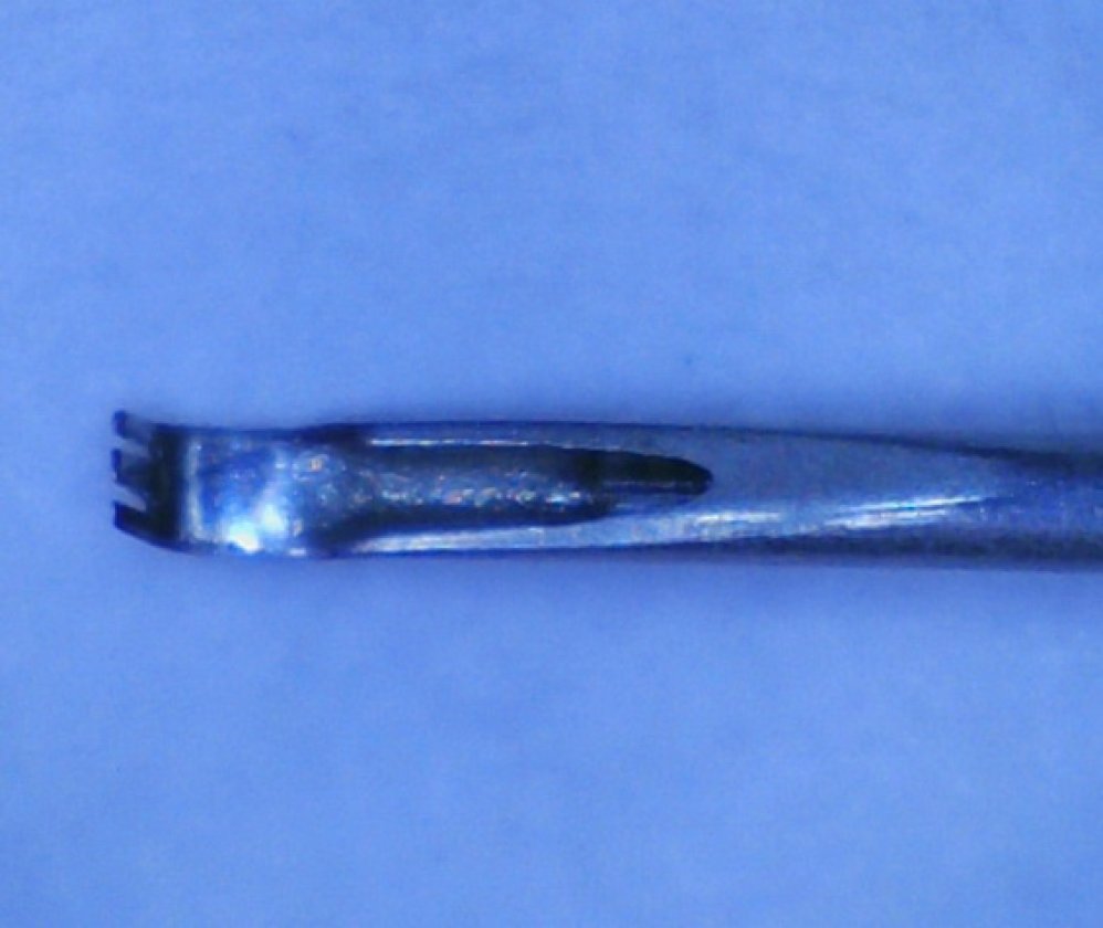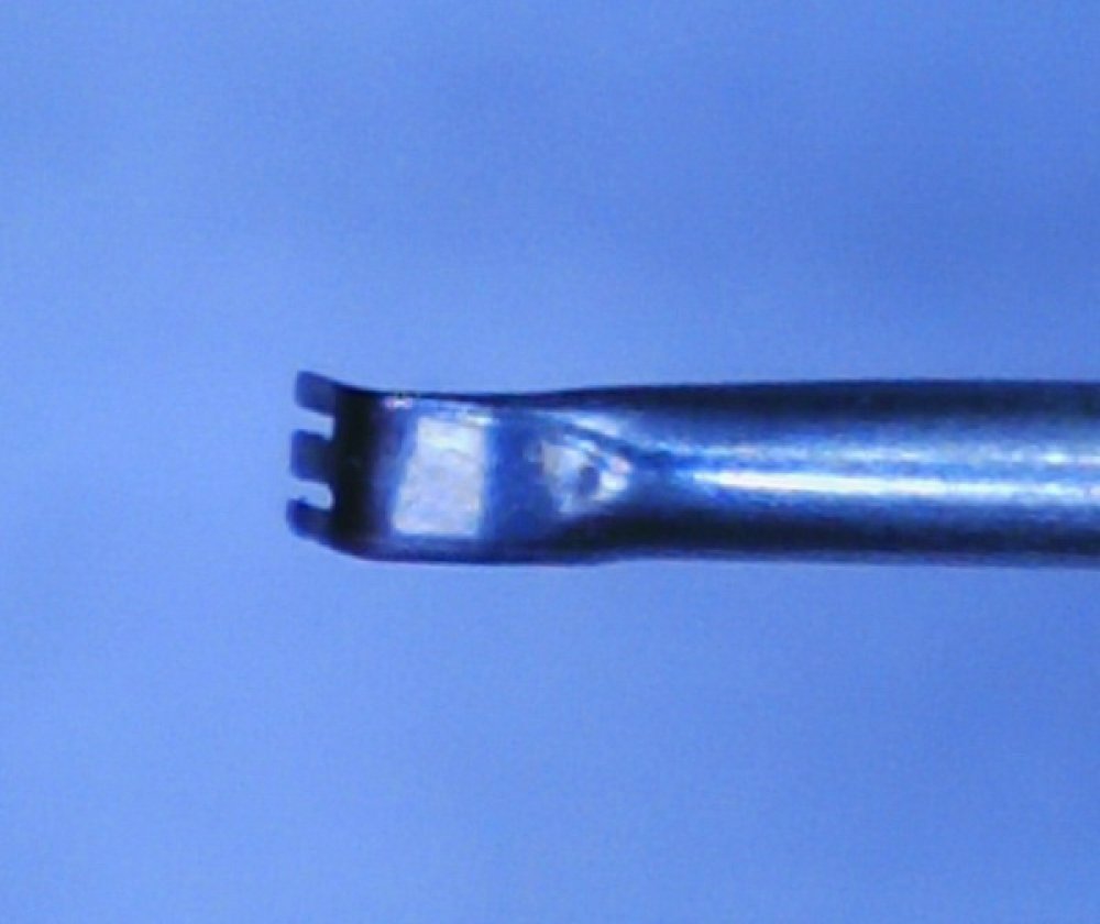 Sirve para desprender y extraer membranas retinales. Punta cuadrada en forma de tenedor con curva que semeja una mano en el mm. distal. Iluminación por fibra óptica