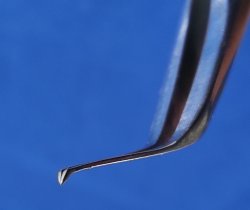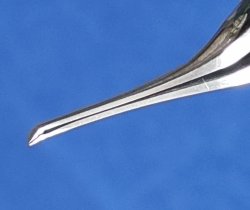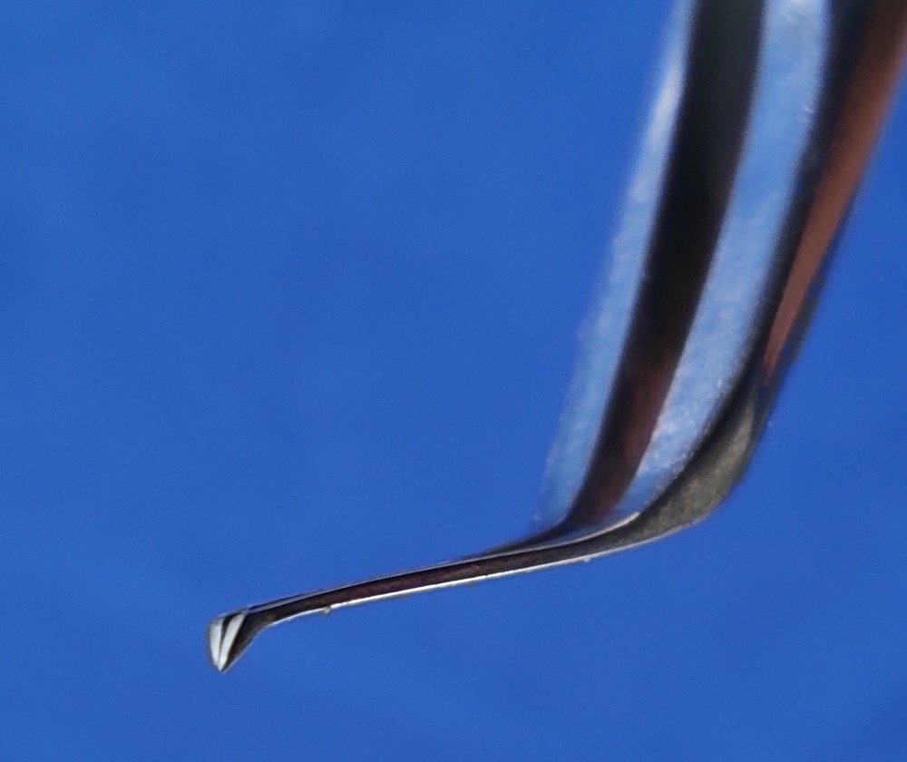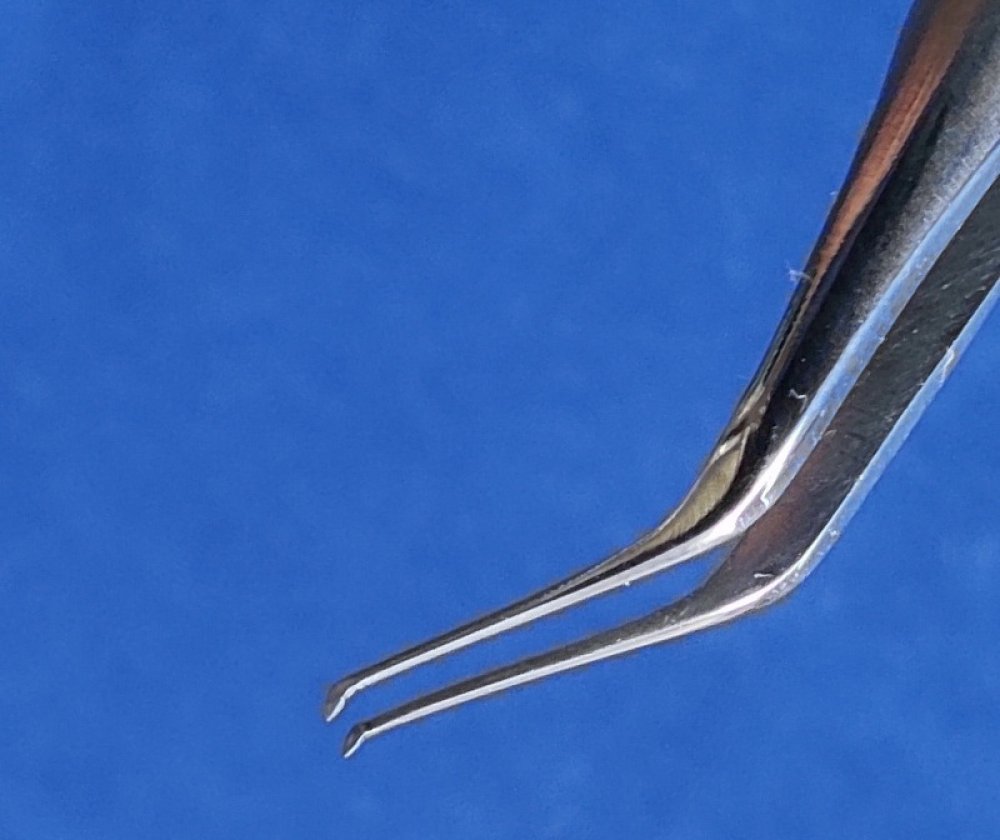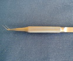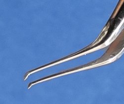 Pinza muy fina y delicada, diseñada para ingresar por incisión de 2.2 mm. Angulación de 45º a 8 mm y punta angulada 80º hacia abajo.
