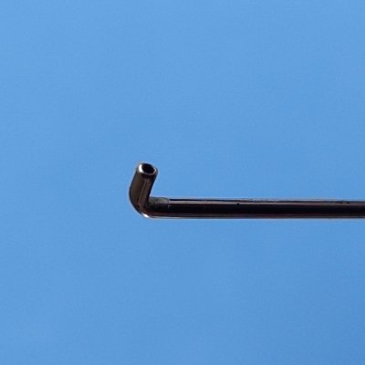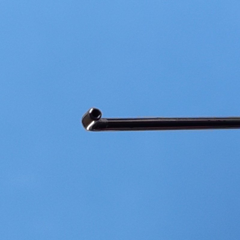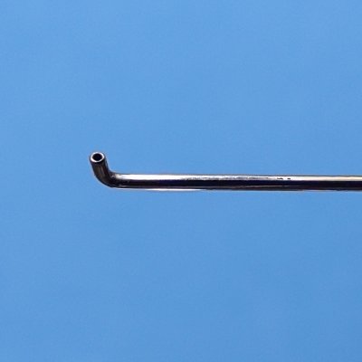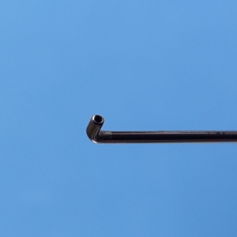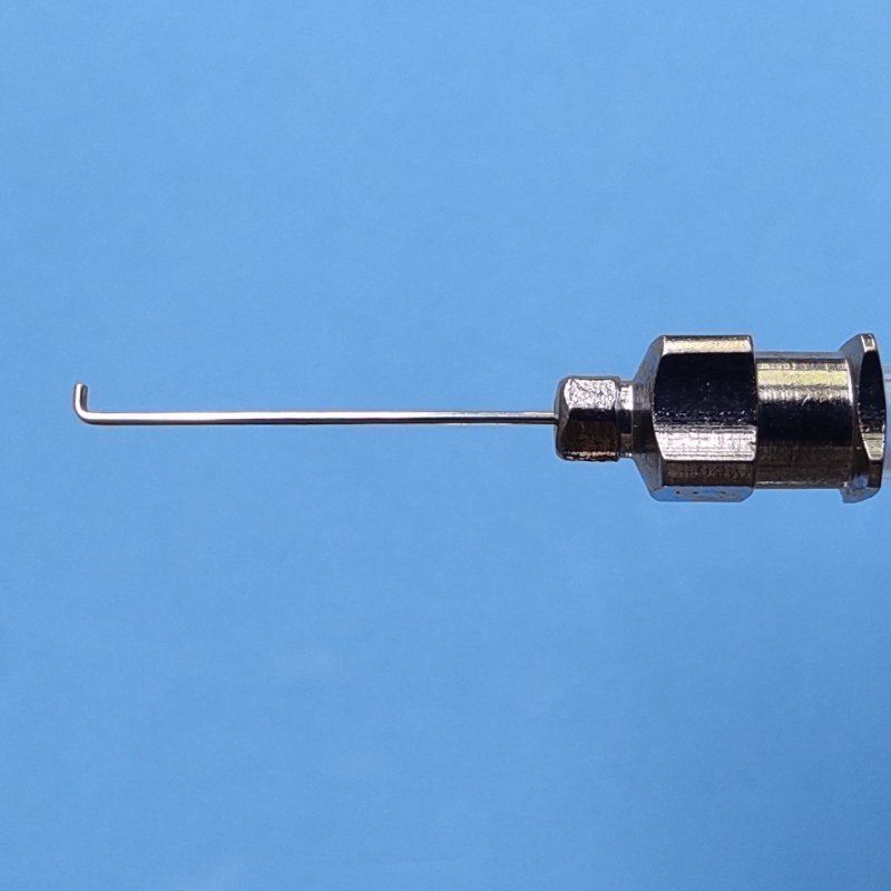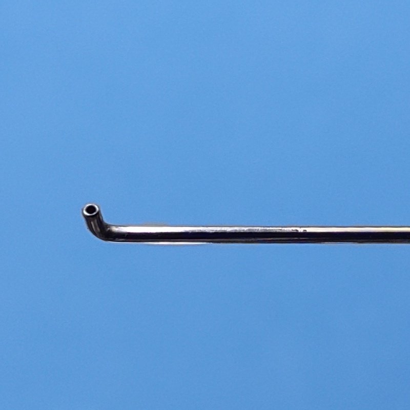 Cánula 25 con punta roma angulada 90° a 1 mm de la punta y pulida que permite realizar la hidrodisección del núcleo del cristalino con comodidad y precisión.