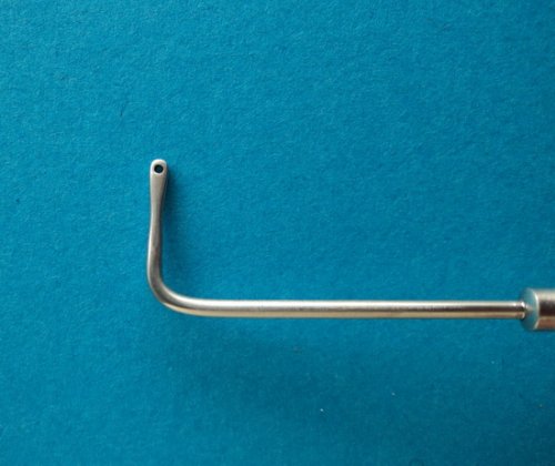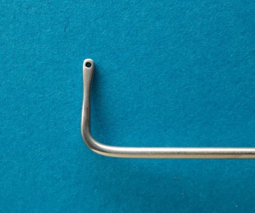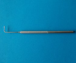 Instrumento clásico que sirve para manipular músculos extraoculares en cirugía de estrabismo o retina. Tiene un plano inclinado que evita que el músculo se pueda soltar y un orificio de 1 mm. para pasar sutura.